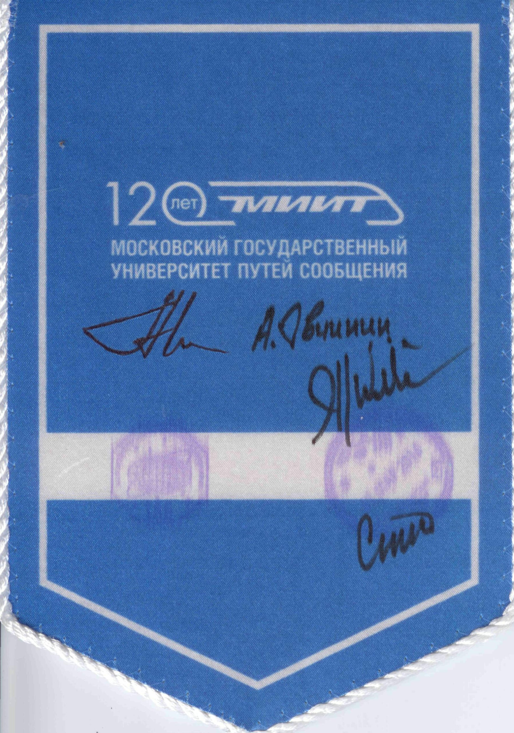 Вернувшись на Землю, герои Космоса передали университету юбилейный вымпел МИИТ со своими автографами.
