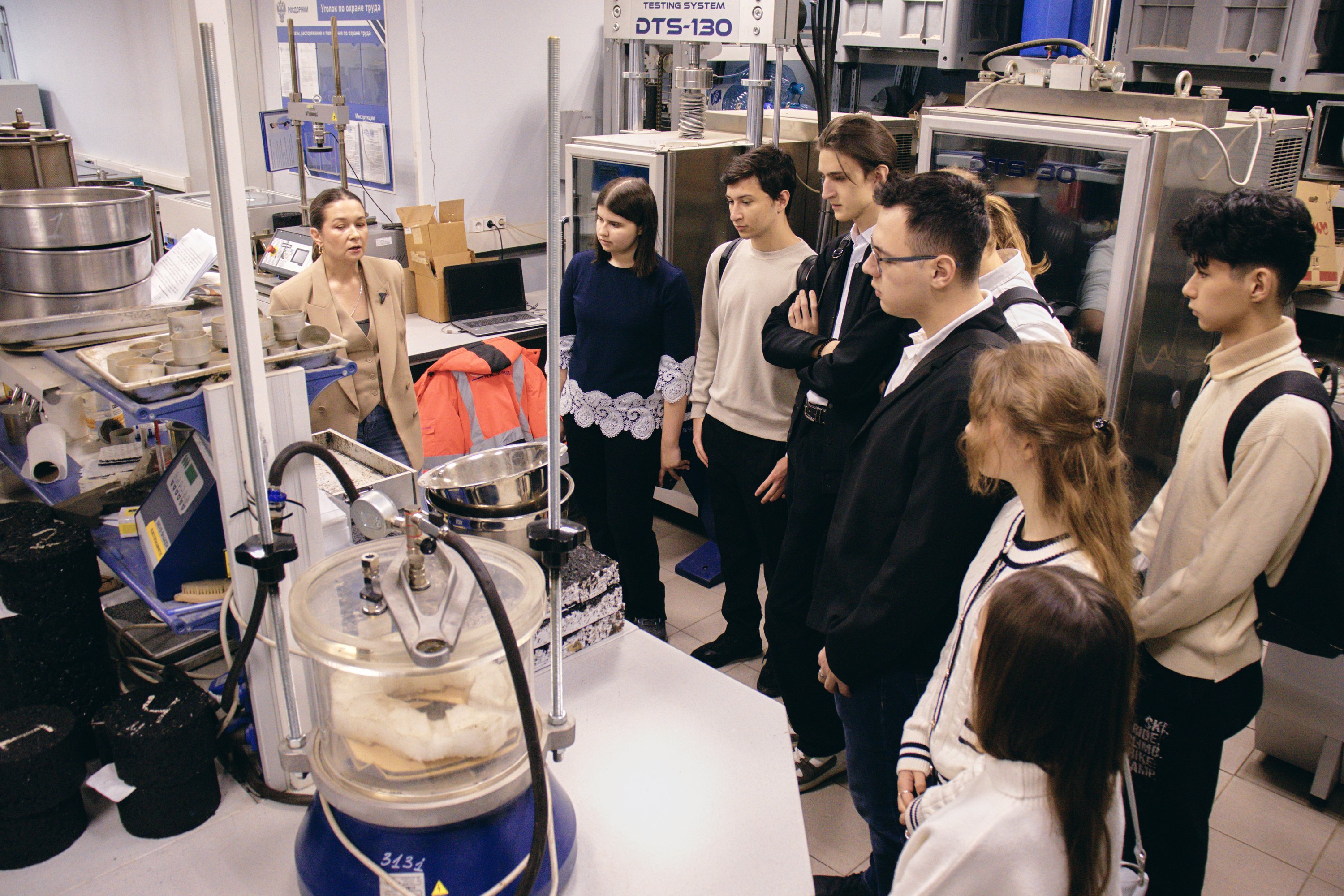 Заместитель начальника управления исследований дорожно-строительных материалов Мария Мерзликина показала ребятам основное оборудование и рассказала подробнее про исследования, которые проводит команда Института. Студенты увидели, как работает оборудование для испытания дорожно-строительных материалов: песка, щебня, битума и битумных вяжущих, грунта, асфальтобетонных смесей и асфальтобетона, цемента, бетона и бетонных смесей, геосинтетических и других, — и испытанные на нём образцы.