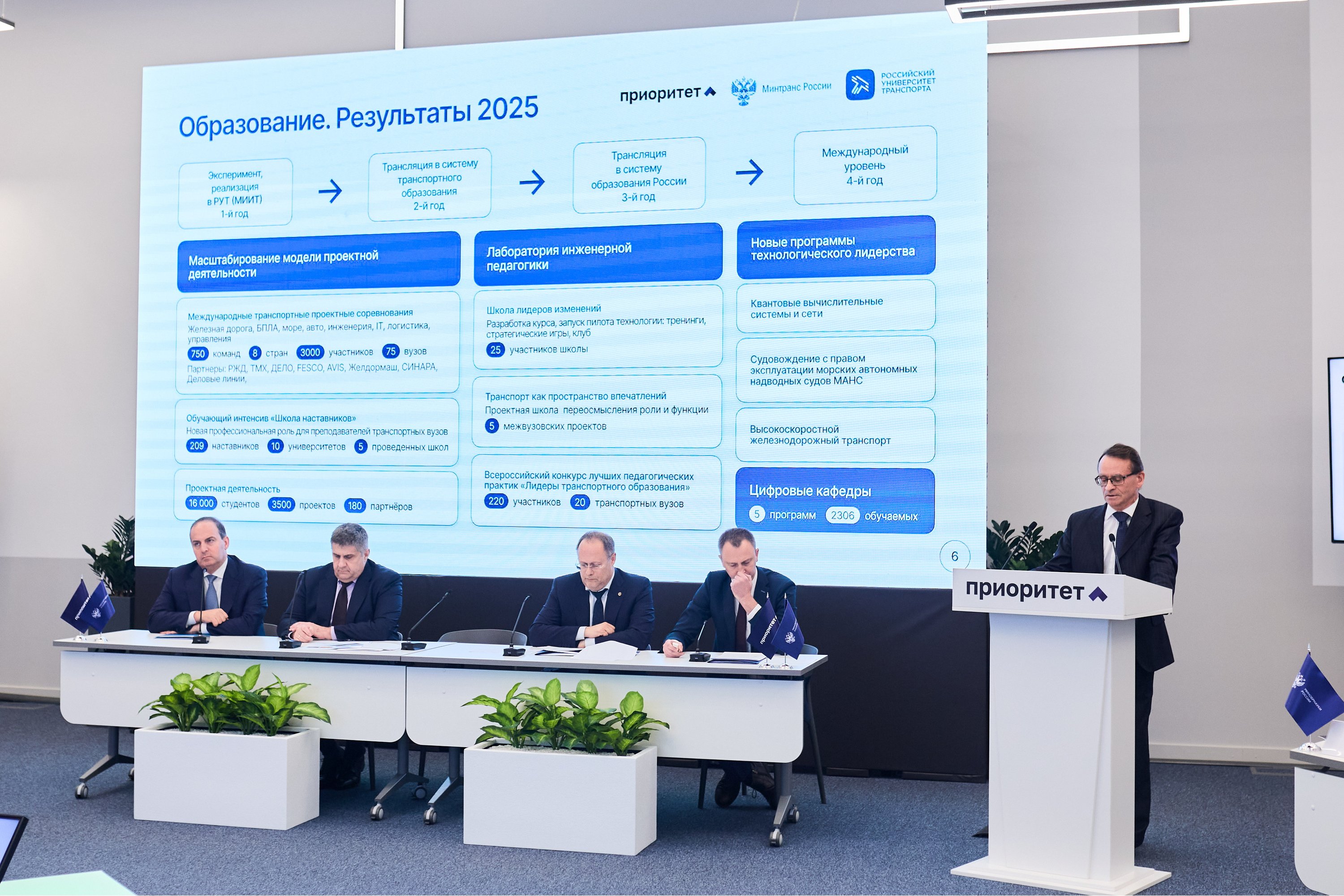 Основной фокус программы «Приоритет 2030» в 2025 году — технологическое лидерство России. Для достижения этой цели РУТ полностью переработал свою программу развития, направив её на получение конкретных продуктов и технологий, востребованных транспортной и смежными отраслями. Результатами этой работы стали запущенные вместе с ключевыми институтами РАН проекты в области безопасности дорожного движения, транспортной логистики, новых материалов, автономного судовождения и влияния климатических изменений на транспортную инфраструктуру.