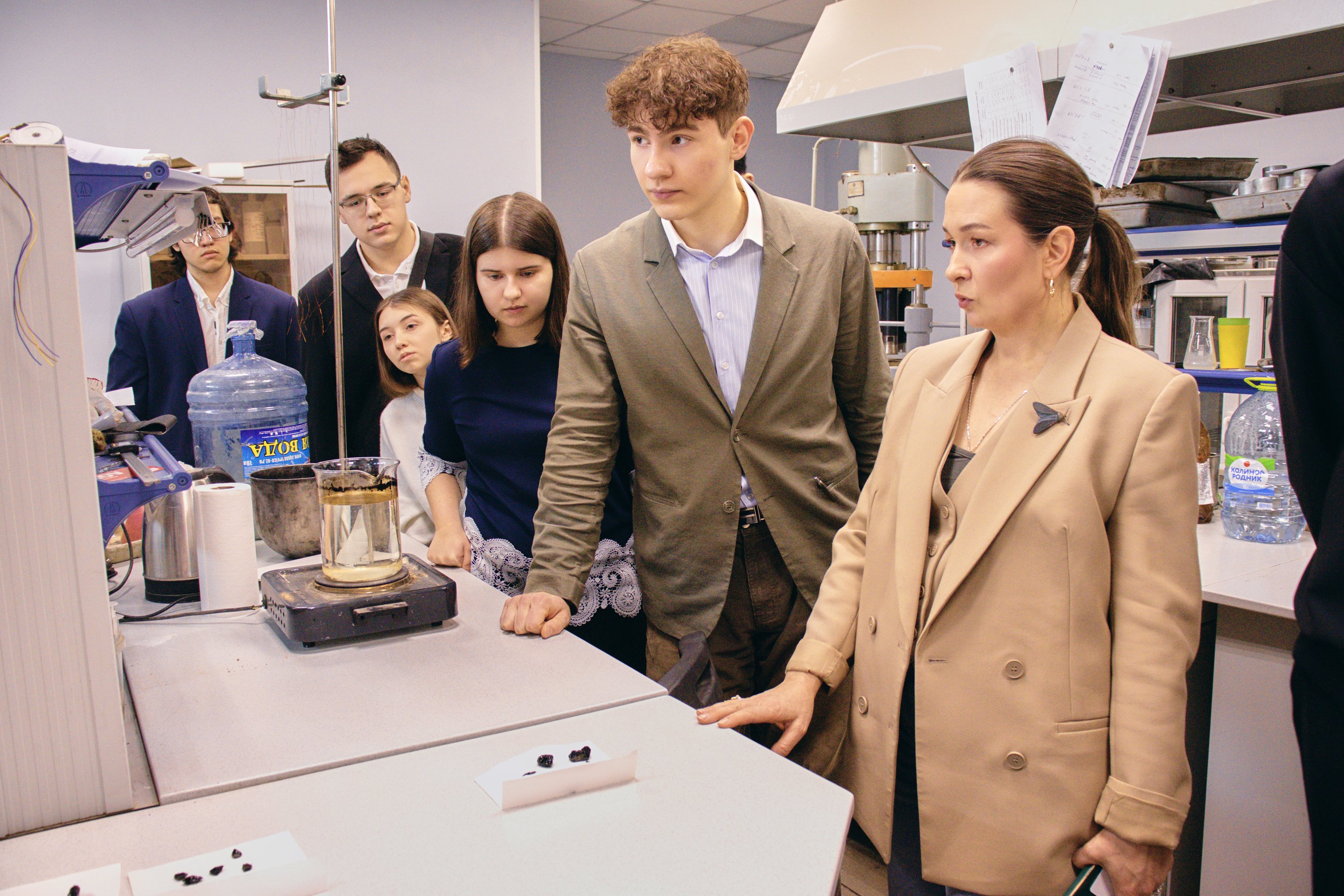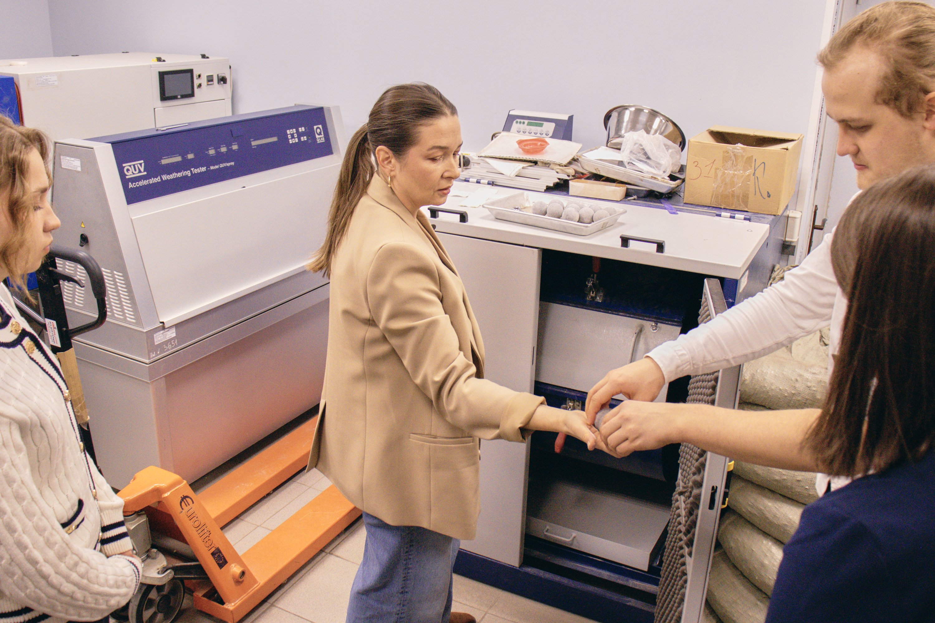 Заместитель начальника управления исследований дорожно-строительных материалов Мария Мерзликина показала ребятам основное оборудование и рассказала подробнее про исследования, которые проводит команда Института. Студенты увидели, как работает оборудование для испытания дорожно-строительных материалов: песка, щебня, битума и битумных вяжущих, грунта, асфальтобетонных смесей и асфальтобетона, цемента, бетона и бетонных смесей, геосинтетических и других, — и испытанные на нём образцы.