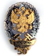 Знак «50 лет в транспортном образовании» представляет собой серебряный венок из лавровых (слева) и дубовых (справа) ветвей. В середине герб России из позолоченного серебра. Внизу лента из позолоченного серебра, на которой черной эмалью написано «в транспортном образовании».